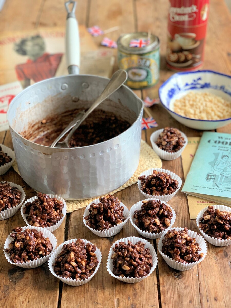 These Chocolate Crispy Cakes are based on a recipe from a Wartime recipe book that was issued by the W.V.S, and would be perfect for a VE Day Party.