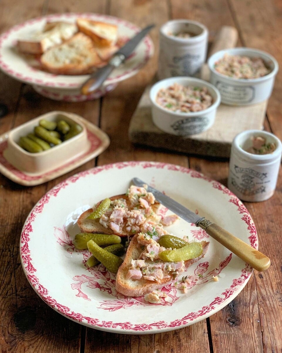 Potted Ham is part of that rather lovely genre of potted food that we Brits love so much. I am an avid fan of all things potted, from potted cheese, to potted beef and potted shrimps. There’s something very comforting about a pot of meat, cheese or fish that is luxuriating in butter with subtle spices and herbs. And, it is just crying out for a large doorstep of bread, toasted of course, so the butter can bathe the hot toast with the captive meat (or cheese, shrimps, kippers etc).