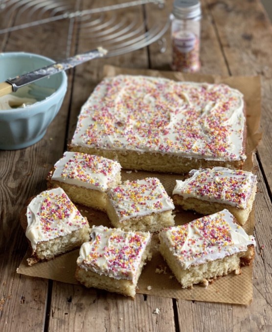 This tray bake “slab” cake is easy to make and even easier to eat, and makes a very generous 15 squares of cake, although I remember our school dinner ladies and cooks serving up giant slabs of this cake from huge trays of 24 portions or more. Do try to use old-fashioned hundreds and thousands, and not posh or glitzy sprinkles for an authentic “school dinners pudding” effect.